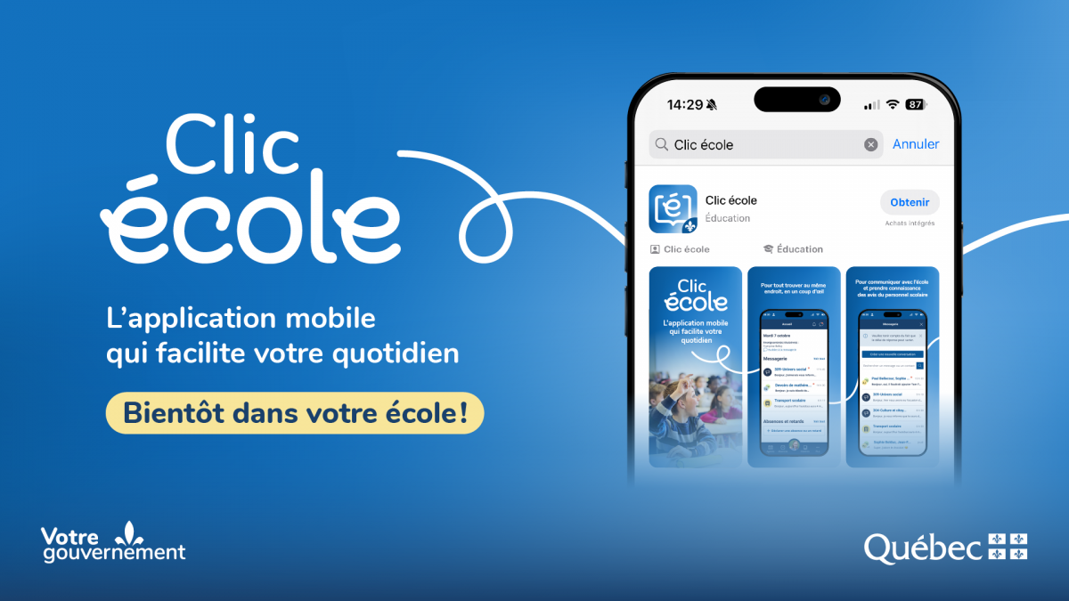 Son déploiement se fera de manière progressive dans l’ensemble des écoles publiques du Québec au cours de l’année scolaire 2025-2026. Clic école représente d’ailleurs l’évolution technologique de l’actuelle application mParent, en réunissant, dans un même outil convivial, les fonctions essentielles pour soutenir la communication entre les écoles et les familles.
